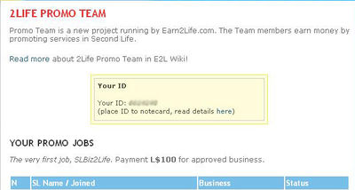 The 2Life Promo Team is a group of Second Life promoters. Joining this team will allow you to earn money by promoting services over Second Life.