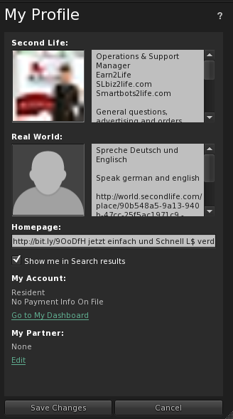 3. Add the link to the "Second Life" text box. ("Real Life" box does not work).