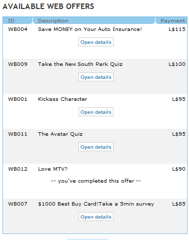 Web Offers offer the ability to earn Linden Dollars (L$) in your web browser simply by completing surveys, installing a piece of software, or registering for a service.